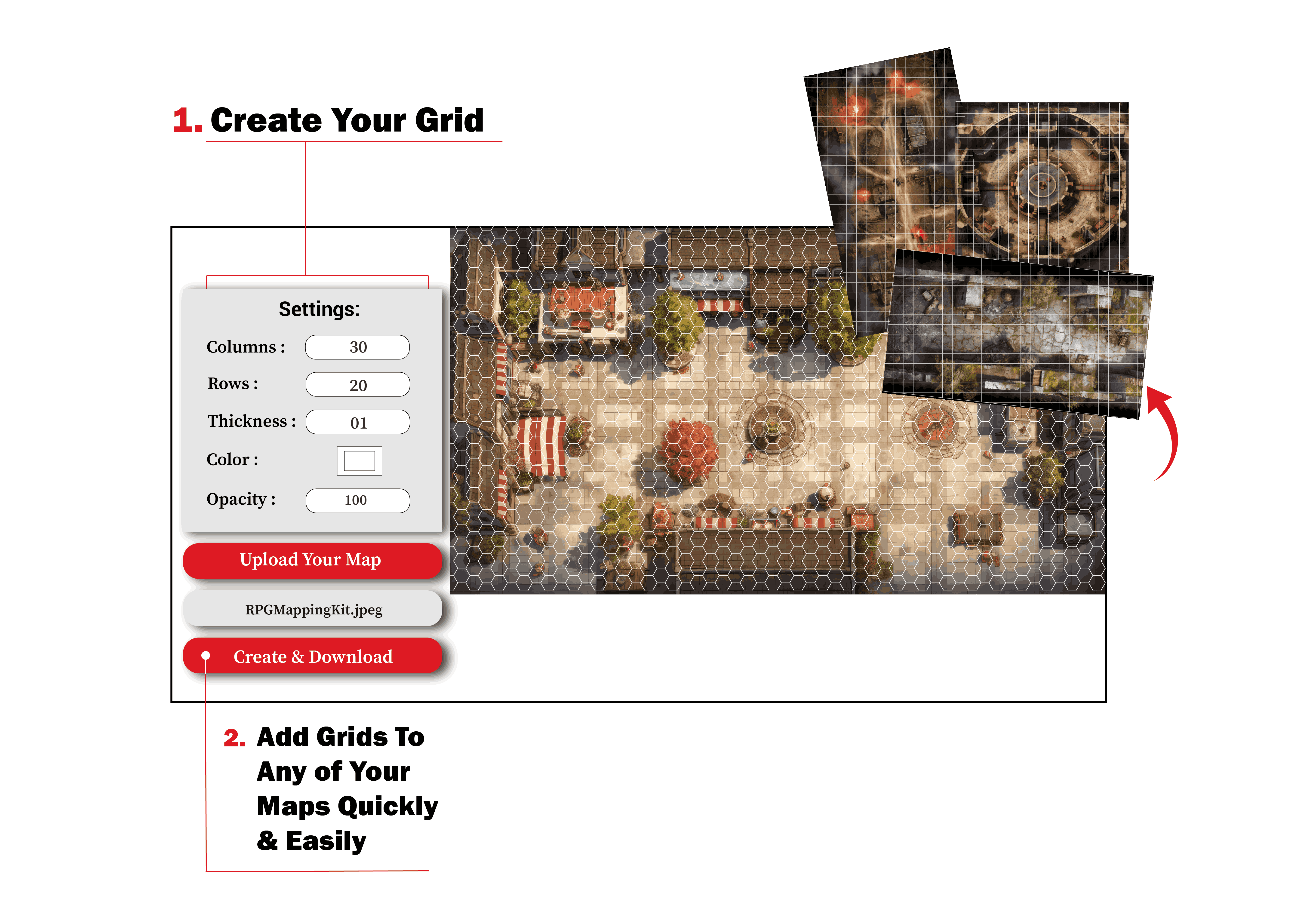 With your maps, you can easily apply square or hex grids β giving you full flexibility for any play style.